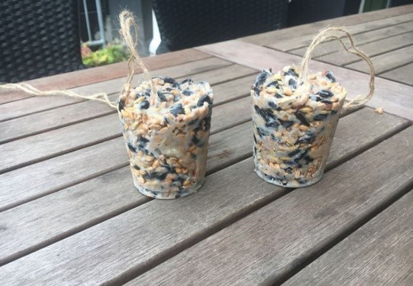Vi støber papbægre og fylder med frø – og du får en fin, færdig mejsekugle med hjem, klar til at hænge op i haven eller på altanen.